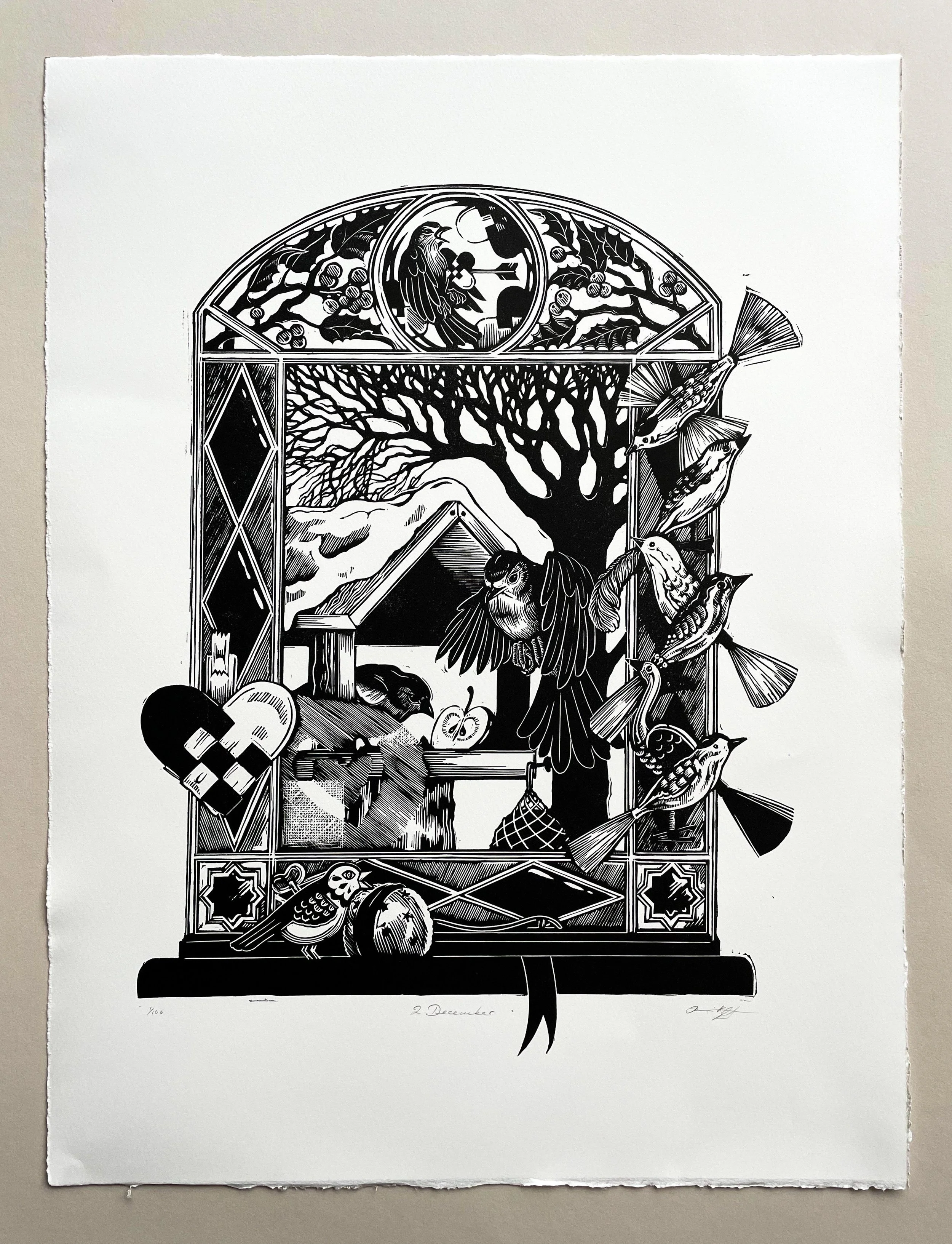 The book “24 dage med rim i December” (24 days of rhymes in December) is out now! With poetry written by Danish author Knud Romer, and fully illustrated with a linocut for each page and day leading up to Christmas, this book was made as a tribute to the beautiful and carefully crafted picture books of fin de siecle publishing. The book itself will make for a wonderful christmas gift and keepsake, but the original linocuts are available for a limited time too. To see more about the process behind these lino illustrations, and check for availability, please follow this link <3